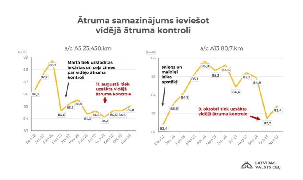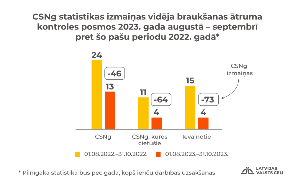 Šī gada augustā un septembrī, salīdzinot ar attiecīgo laika periodu 2022. gadā, vidējā ātruma kontroles posmos CSNg skaits samazinājies par 46 %, CSNg ar cietušajiem skaits par 64 % un CSNg ar ievainotajiem skaits par 73 %. Tomēr divi mēneši ir vēl neliels periods kvalitatīvas statistikas iegūšanai, precīzāki dati būs redzami, kad iekārtas būs darbojušās pilnu gadu.