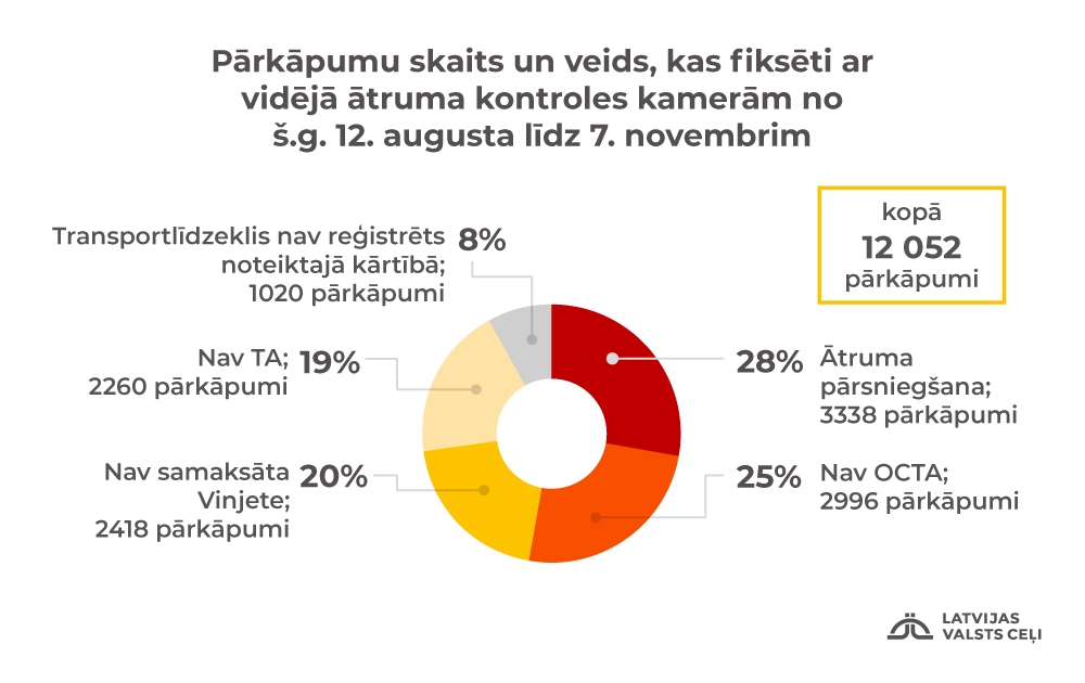 Kopumā no vairāk nekā 12 tūkstošiem fiksēto pārkāpumu, 28 % ir par ātruma pārsniegšanu, 25 % par neiegādātu OCTA, 20 % par nenopirktu vinjeti, 19 % par dalību satiksmē bez tehniskās apskates, bet 8 % par transporta reģistrācijas pārkāpumiem.
