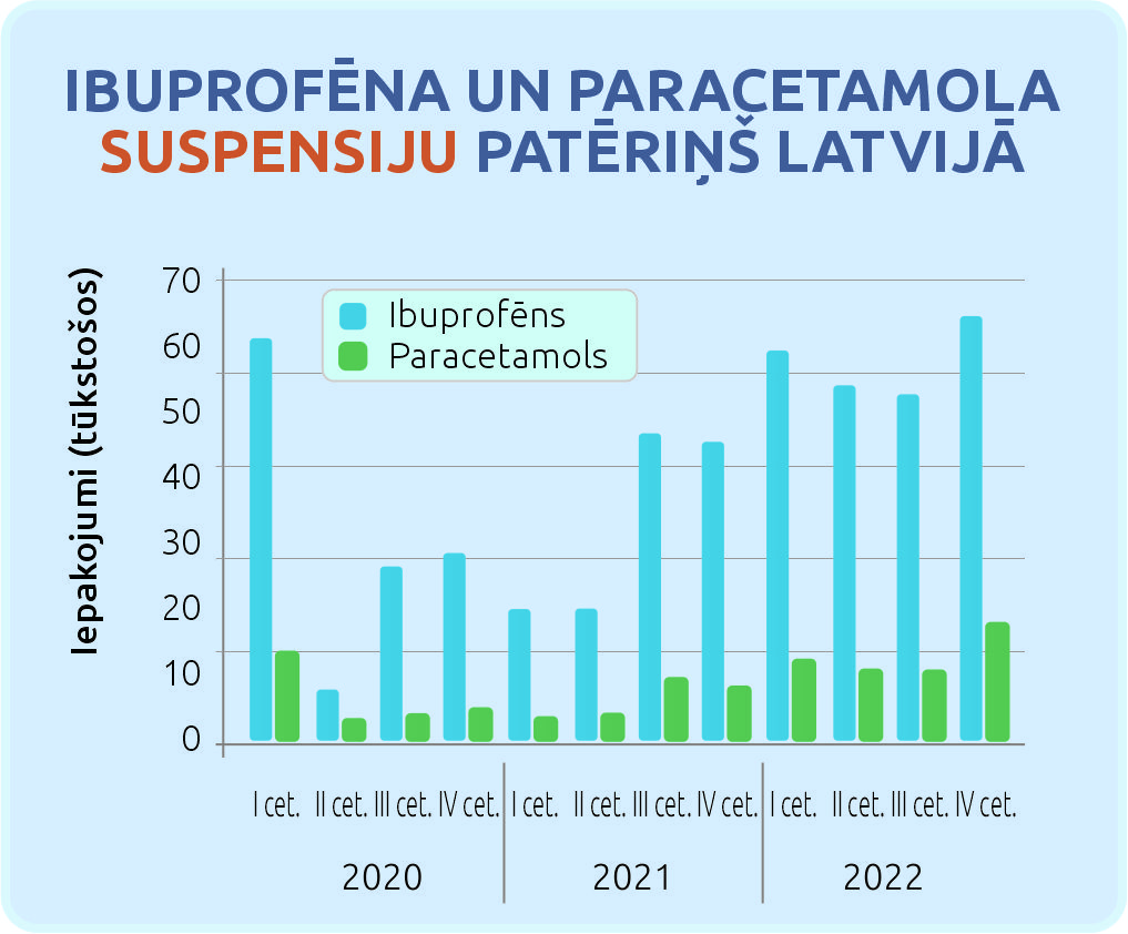 Zāļu patēriņa dati liecina, ka antibiotiku, ibuprofēna un paracetamola suspensiju piegādes Latvijai tiek veiktas. Lieltirgotavas aptiekām piegādā šīs zāles. Vienlaikus, ņemot vērā sezonālo ietekmi, ir brīži, kad pieprasījums pārsniedz piegāžu apjomu.