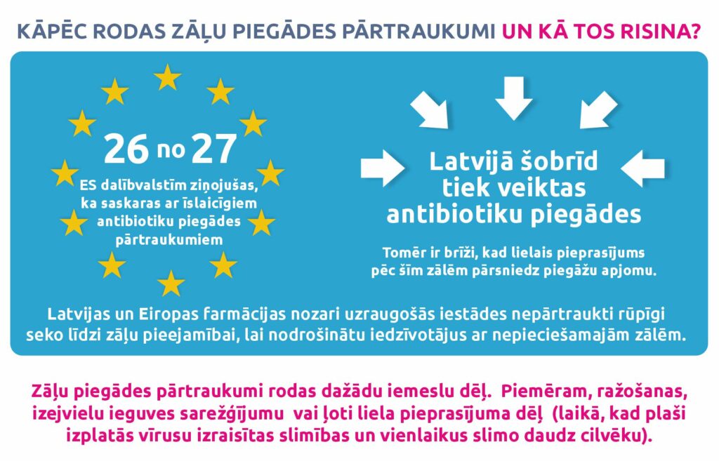 Zāļu valsts aģentūra (ZVA) informē, ka Eiropas Komisija un Eiropas zāļu aģentūru vadītāji (HMA), sadarbojoties Zāļu piegādes pārtraukumu un drošuma koordinācijas izpildgrupā (MSSG), seko līdzi un reaģē uz antibiotiku piegādes pārtraukumiem šobrīd Eiropas Savienībā (ES).