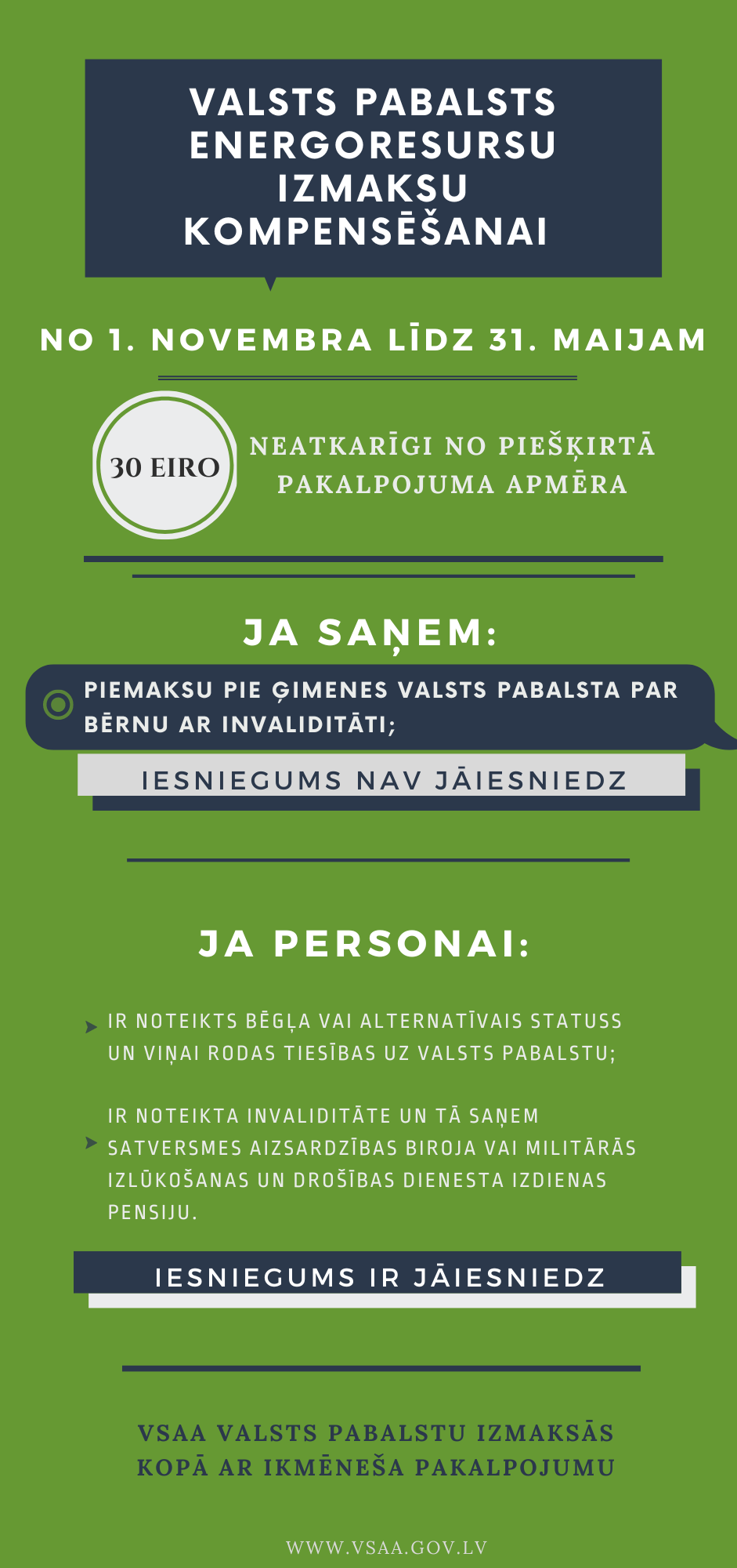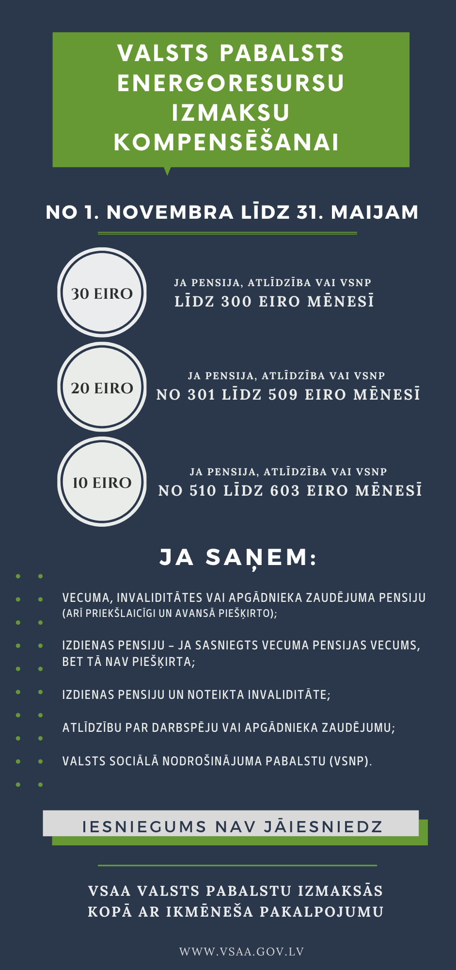 Valsts sociālās apdrošināšanas aģentūra (VSAA) novembrī sāk izmaksāt valsts pabalstu 30, 20 vai 10 eiro apmērā pensiju, atlīdzību un valsts sociālā nodrošinājuma pabalsta (VSNP) saņēmējiem, lai kompensētu energoresursu un ar to saistīto pakalpojumu sadārdzinājumu. No 2022 . gada 1. novembra līdz 2023. gada 31. maijam VSAA izmaksās valsts pabalstu kopā ar ikmēneša pakalpojumu.