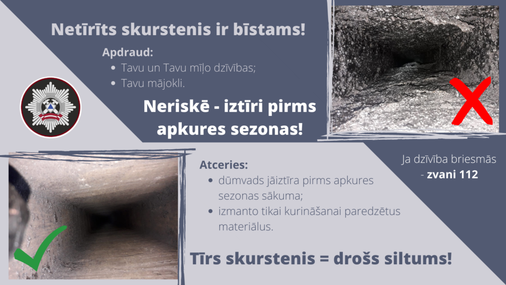 VUGD atgādina, ka pirms apkures sezonas sākuma dūmvadi ir jāattīra no sodrējiem. Tas palielinās jūsu apkures iekārtas siltuma atdevi un novērsīs traģisku ugunsgrēku izcelšanos. VUGD apkopotā informācija liecina, ka ik gadu vairāk nekā 500 Latvijas mājokļu dūmvados deg sodrēji, kas var izraisīt un arī izraisa postošus ugunsgrēkus.