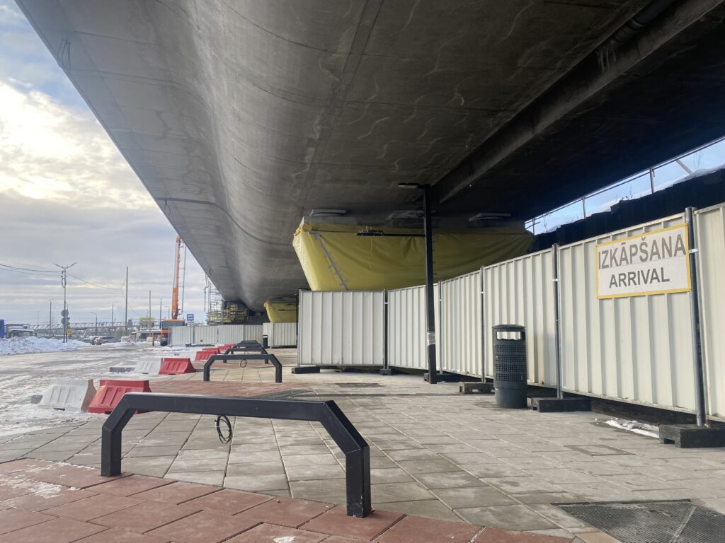Zem jaunuzbūvētās "Rail Baltica" estakādes Rīgas autoostā uzsākta autobusu apkalpošana