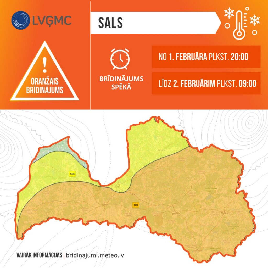 1.februāra vakarā un naktī uz 2.februāri Latvijā gaidāms stiprs sals ar gaisa temperatūru -20 līdz -24°, lielā teritorijas daļā no -25 līdz -29°, bet vietām dienvidos – arī no -30 līdz -31°. Gaisa temperatūra pakāpeniski sāks paaugstināties rīt priekšpusdienā, informē Latvijas Vides ģeoloģijas un meteoroloģijas centrs.