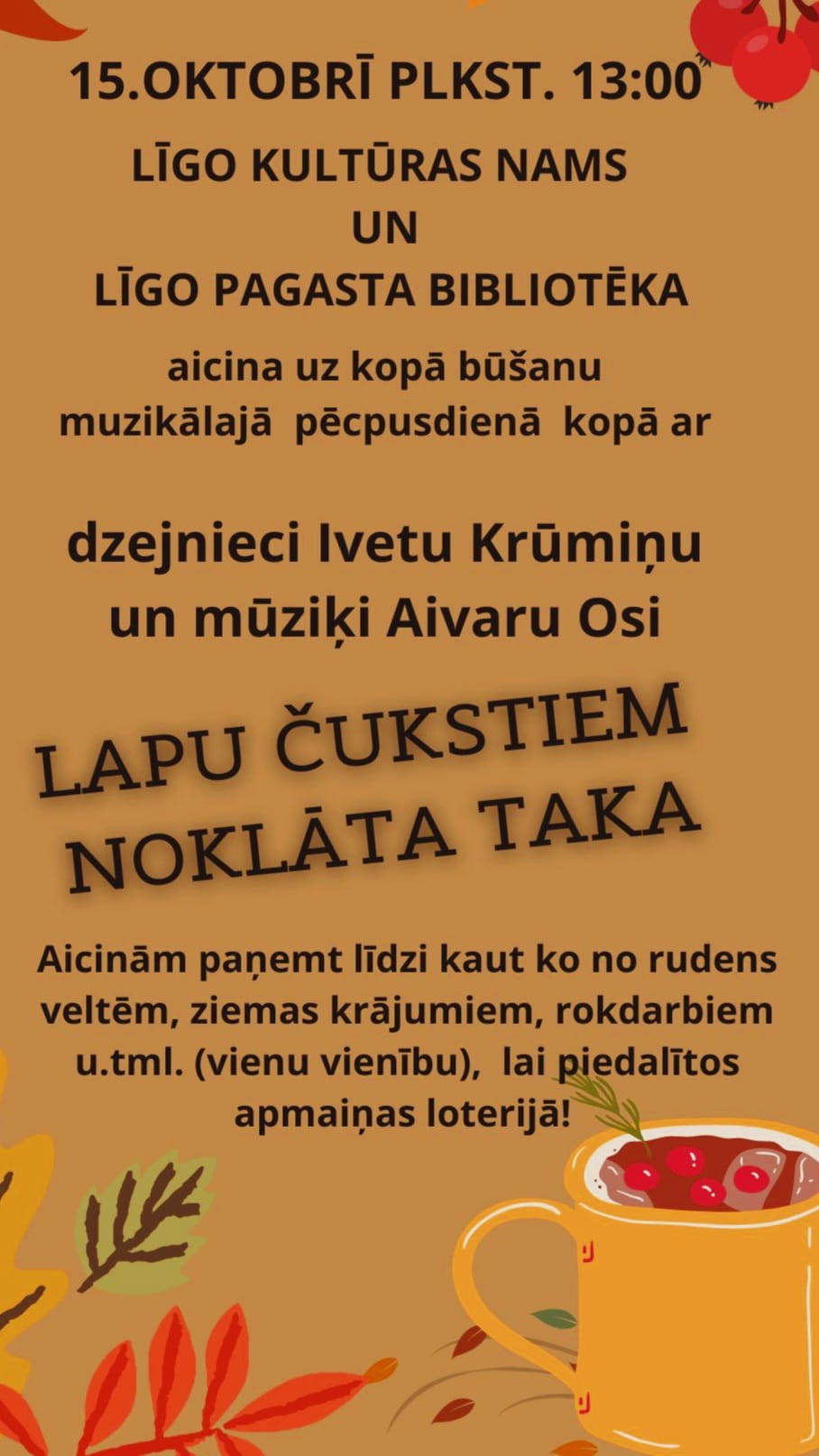 15.oktobrī 13.00 Līgo kultūras namā – atpūtas pasākums “Lapu čukstiem noklāta taka” kopā ar dzejnieci Ivetu Krūmiņu un mūziķi Aivaru Osi. Ieeja – brīva.