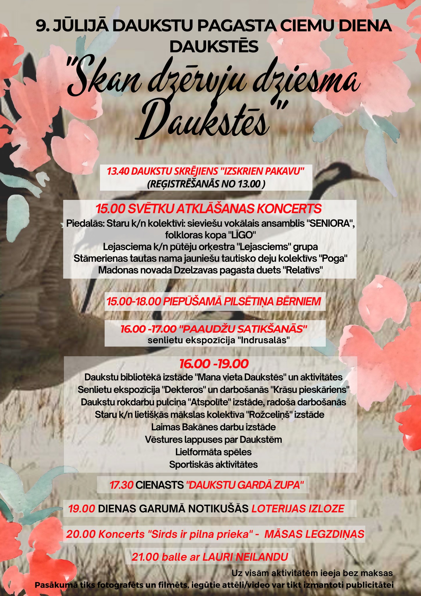 9.jūlijā Daukstu pagastā pie sociālās aprūpes centra “Dzērves” – ciemu diena “Skan dzērvju dziesma Daukstēs”.