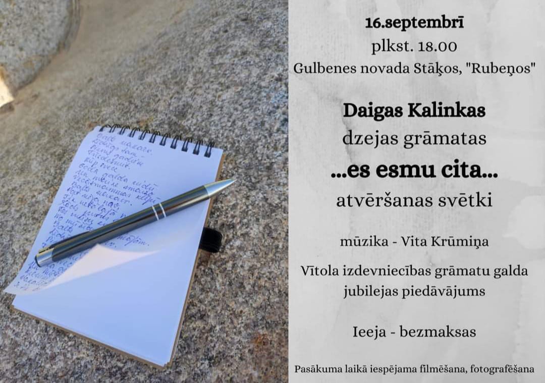 16.septembrī 18.00 Stradu pagastā, Stāķos, “Rubeņos” – Daigas Kalinkas dzejas grāmatas “…es esmu cita…” atvēršanas svētki. Ieeja – brīva.