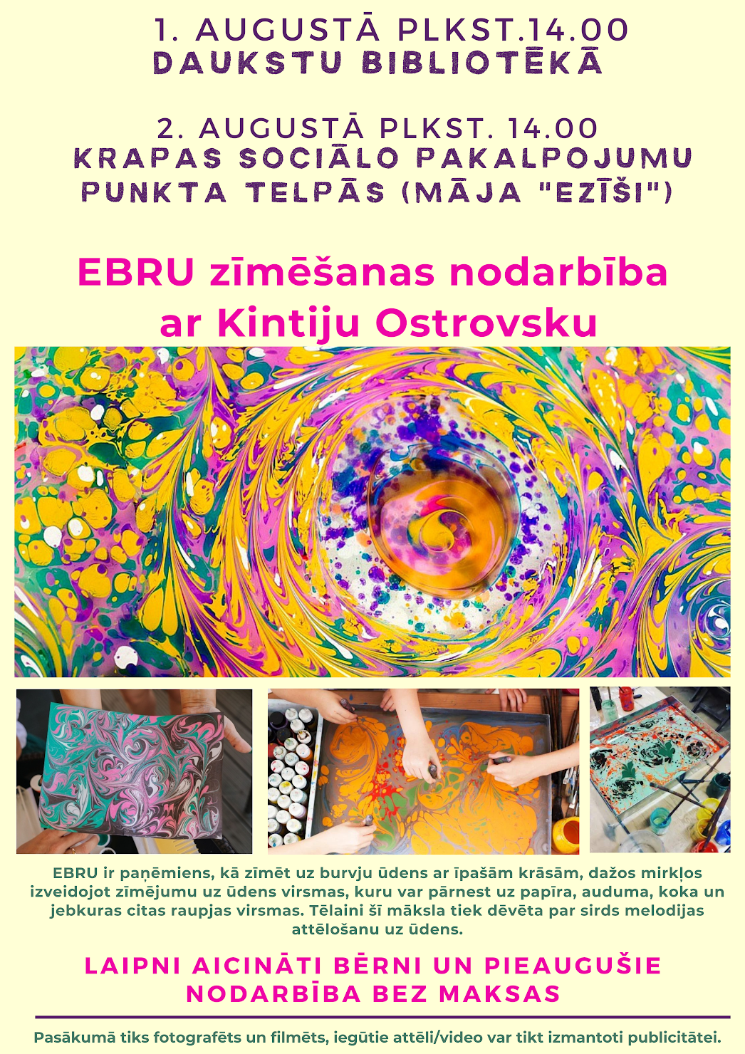 1. augustā 14:00 Daukstu bibliotēkā “Ebru zīmēšanas nodarbība ar Kintiju Ostrovsku”. Aicināti gan bērni, gan pieaugušie. Ieeja – bez maksas.