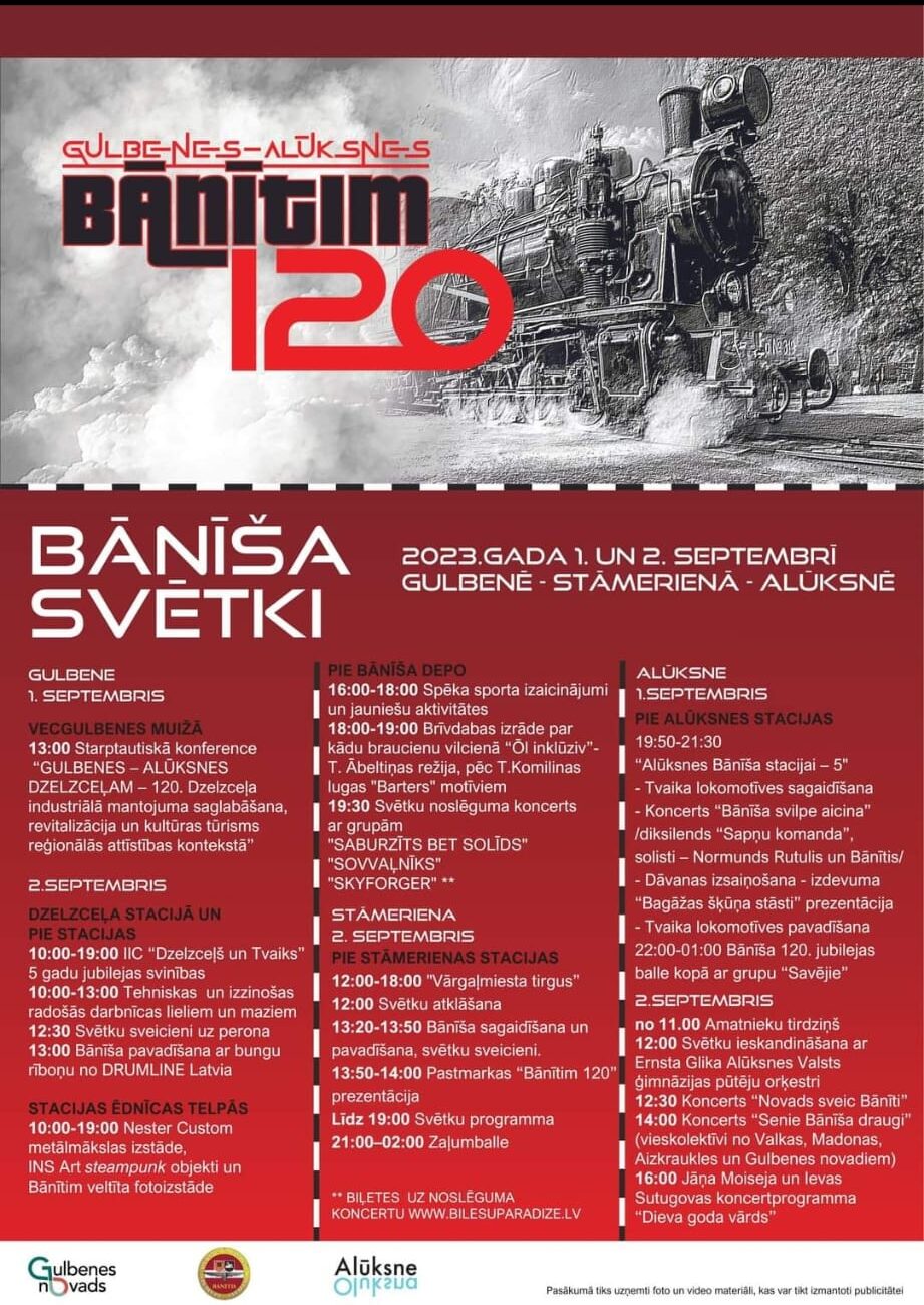 Gulbenē dzelzceļa stacijā un pie stacijas: no 10.00 IIC “Dzelzceļš un Tvaiks” 5 gadu jubilejas svinības; 10.00-13.00 – tehniskas radošās darbnīcas lieliem un maziem; 12.30-12.55 – svētku sveicieni un uzrunas; 13.00 – bānīša pavadīšana ar bungu rīboņu no “Drumline Latvia”. Visas dienas garumā ēdnīcas telpās – bānītim veltīta fotoizstāde, “Nester Custom” metālmākslas izstāde un trafaretu gleznošanas darbnīca.