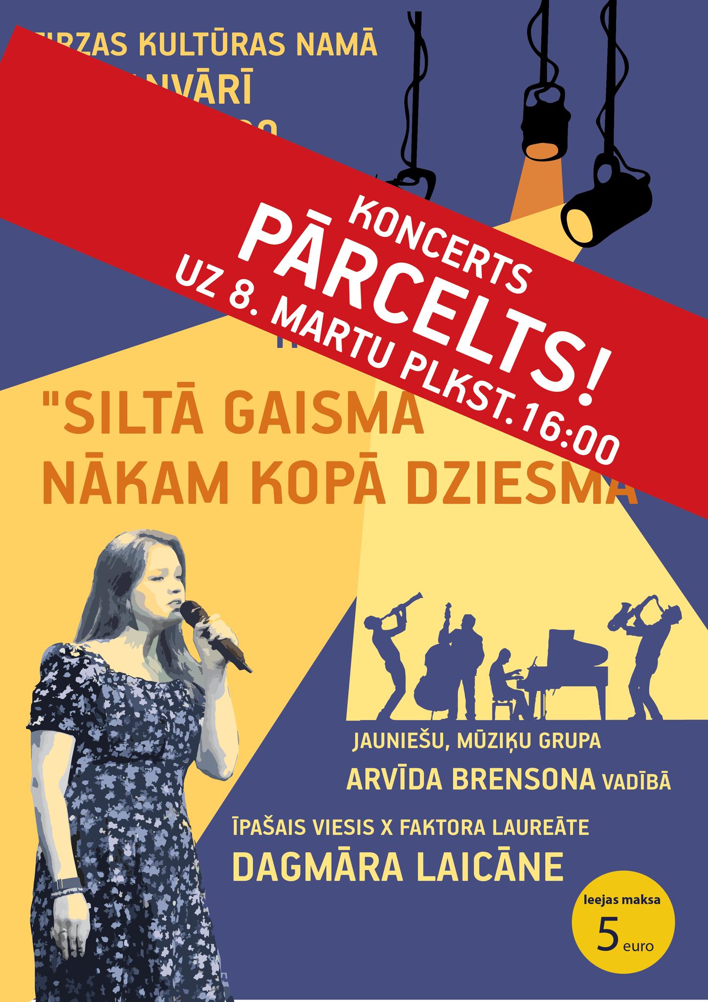 8. martā 16.00 Tirzas kultūras namā – koncerts “Siltā gaismā nākam kopā dziesmā”. Piedalīsies jauniešu mūziķu grupa Arvīda Brensona vadībā, īpašais viesis – “X faktora” laureāte Dagmāra Laicāne.