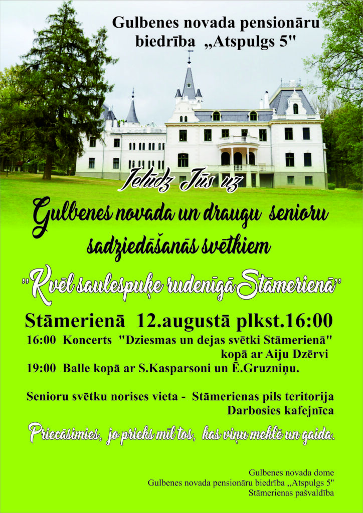 12.augustā 16.00 Stāmerienā – Gulbenes novada senioru un draugu sadziedāšanās svētki “Kvēl saulespuķe rudenīgā Stāmerienā”. Būs transports 14.00 pie Gulbenes kultūras centra.