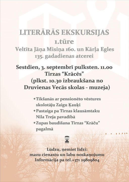 3. septembrī 11:00 literārā ekskursija Tirzas “Krācēs” (10:30 izbraukšana no Druvienas vecās skolas-muzeja).
