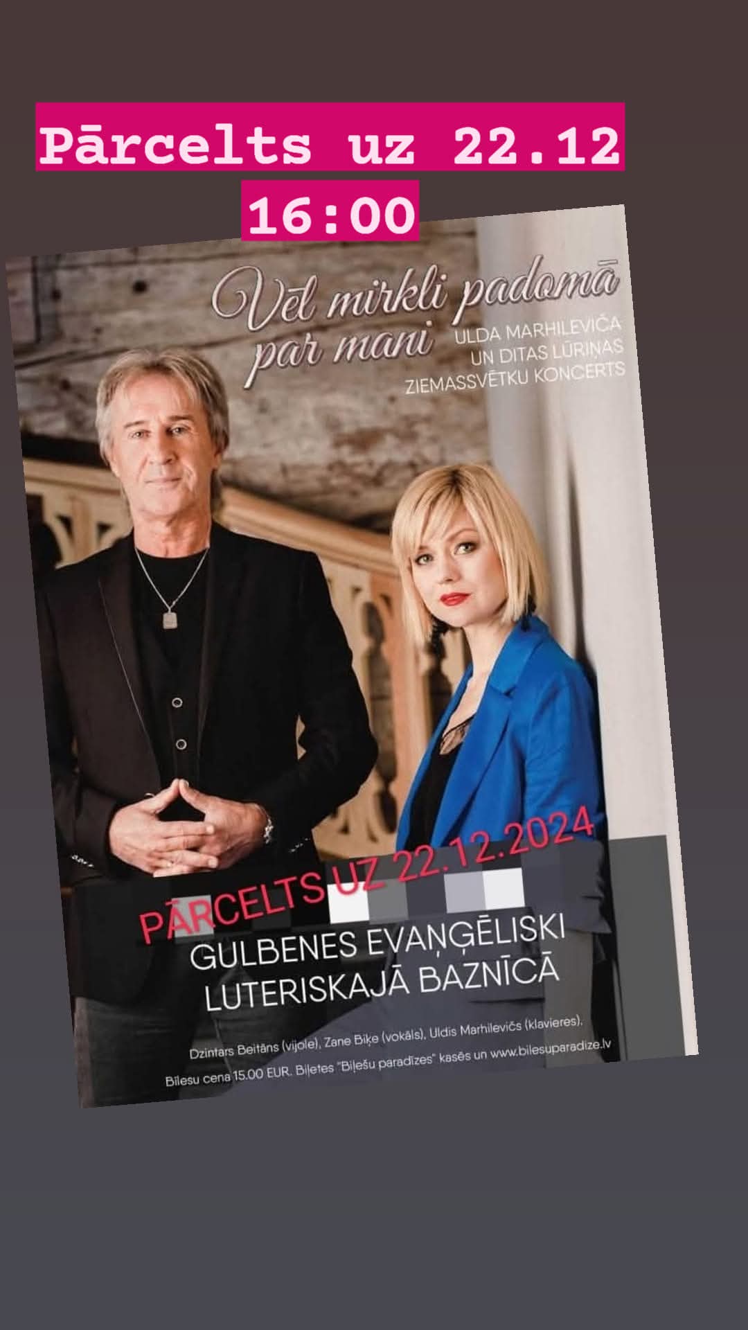 8.decembrī 16.00 Gulbenes evaņģēliski luteriskajā baznīcā paredzētais Ditas Lūriņas un Ulda Marhileviča Ziemassvētku koncerts “Vēl mirkli padomā par mani…” komponista slimības dēļ pārcelts uz 22.decembri. Koncertu būs iespējams apmeklēt ar jau iegādātajām biļetēm.