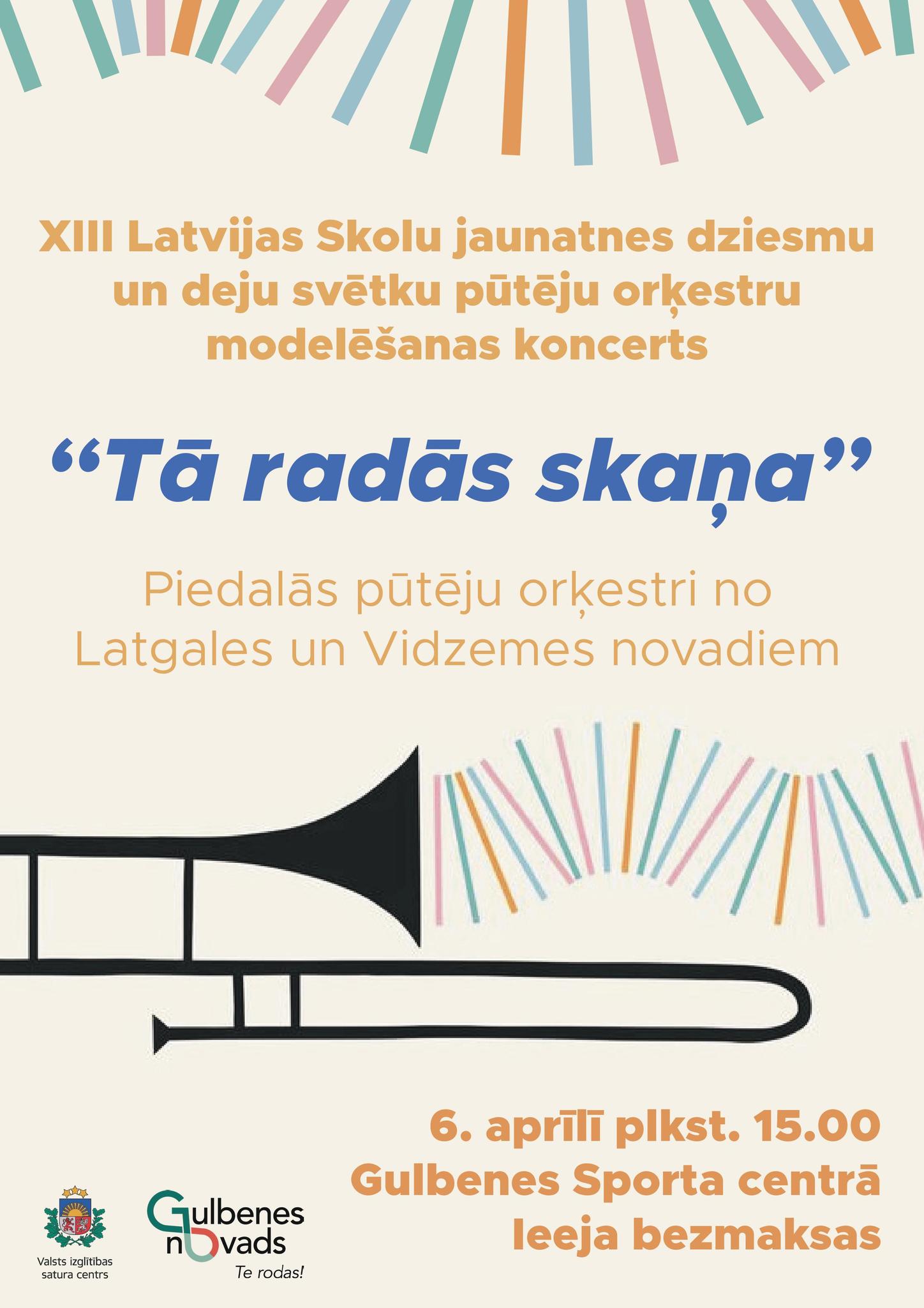 6.aprīlī 15.00 Gulbenes sporta centrā – XIII Latvijas Skolu jaunatnes dziesmu un deju svētku pūtēju orķestru modelēšanas koncerts “Tā radās skaņa”. Piedalīsies pūtēju orķestri no Vidzemes un Latgales novadiem. Ieeja – brīva.