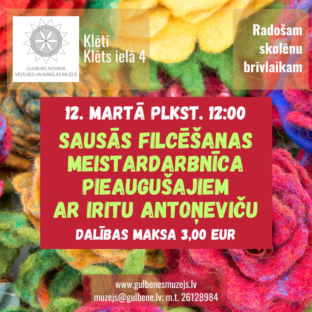 Sausās filcēšanas meistardarbnīca ar Iritu Antoņeviču Gulbenē
