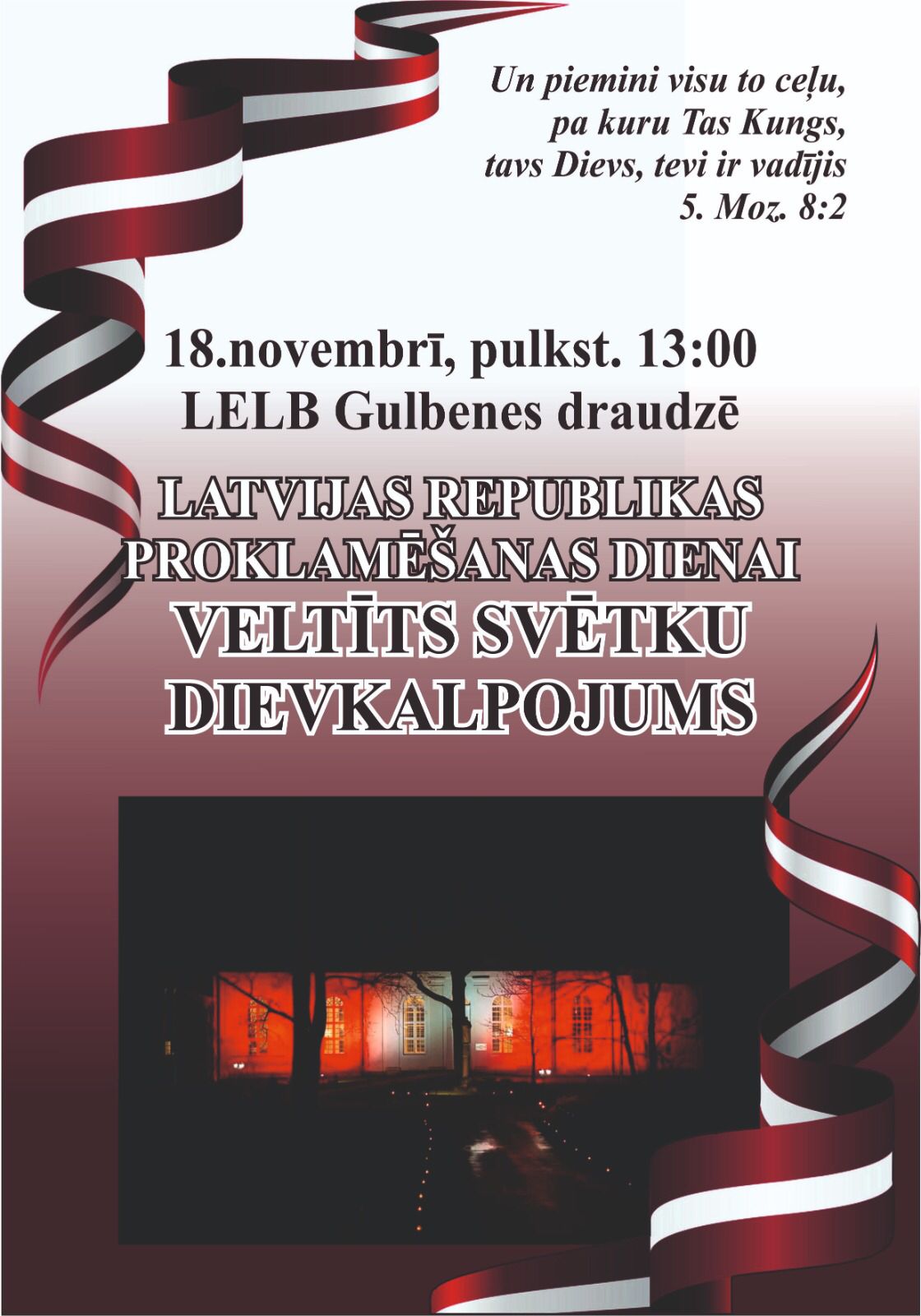 18.novembrī 13.00 Gulbenes evaņģēliski luteriskajā baznīcā – Latvijas Republikas proklamēšanas 105.gadadienai veltīts dievkalpojums.