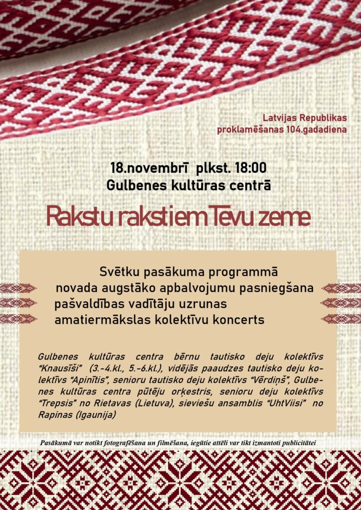 18.novembrī Gulbenē: 9.45 pie pieminekļa par Latvijas brīvību kritušajiem Gulbenes draudzes locekļiem – ziedu nolikšana; 10.00 evaņģēliski luteriskajā baznīcā – dievkalpojums; 15.00 novada pašvaldības administrācijas ēkā – novada pašvaldības apbalvojumu pasniegšana; 17.00 pie bibliotēkas – vides objekta “Goda bibliotēka” svinīga papildināšana; 18.00 kultūras centrā – svētku koncerts “Rakstu rakstiem Tēvu zeme” un novada augstāko apbalvojumu pasniegšana, piedalīsies amatiermākslas kolektīvi no Gulbenes, Repinas (Igaunija), Rietavas (Lietuva), ieeja – brīva.