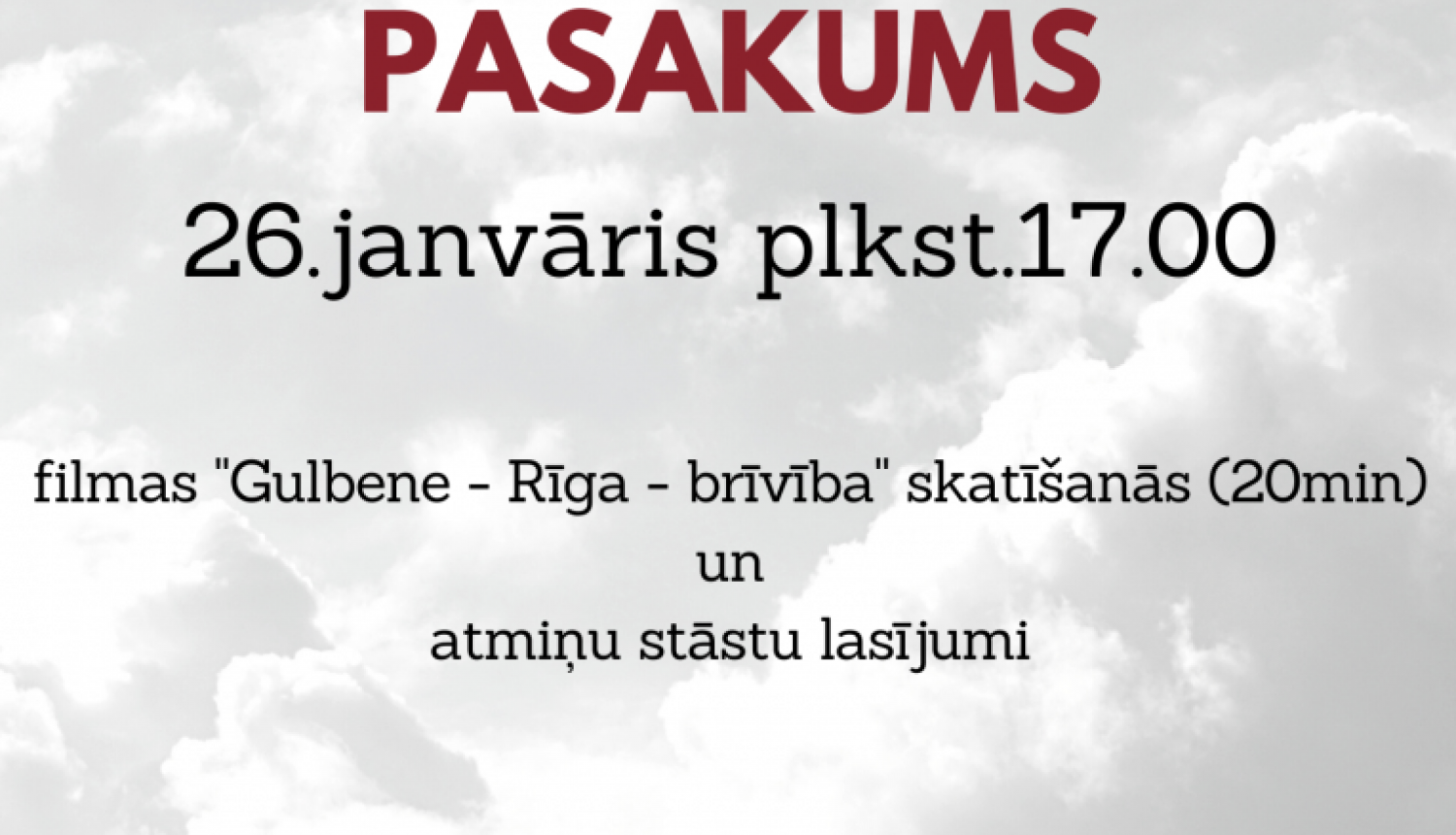 26.janvārī plkst.17.00 Gulbenes novada bibliotēkā – Barikāžu atceres pasākums. Tikšanās un saruna par brīvību, mutvārdu vēstures saglabāšanu un to, kādēļ ir svarīgi atcerēties barikāžu laiku. Novada jauniešu veidotā filma “Gulbene – Rīga – brīvība”, kura ir par par mūsu novadnieku barikāžu stāstiem. Filmas garums ir 20 min. Pasākumā piedalīsies Gulbenes novada vēsturnieces Ineta Bauere un Aivija Grīnberga, filozofe un režisore Monta Gāgane, kā arī pārstāvis no Zemessardzes 26. kājinieku bataljona.