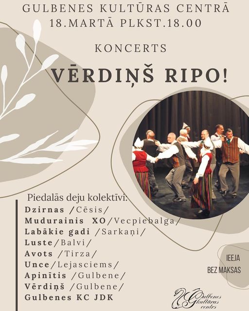 18.martā 18.00 Gulbenes kultūras centrā – deju koncerts “Vērdiņš ripo”. Ieeja – brīva.