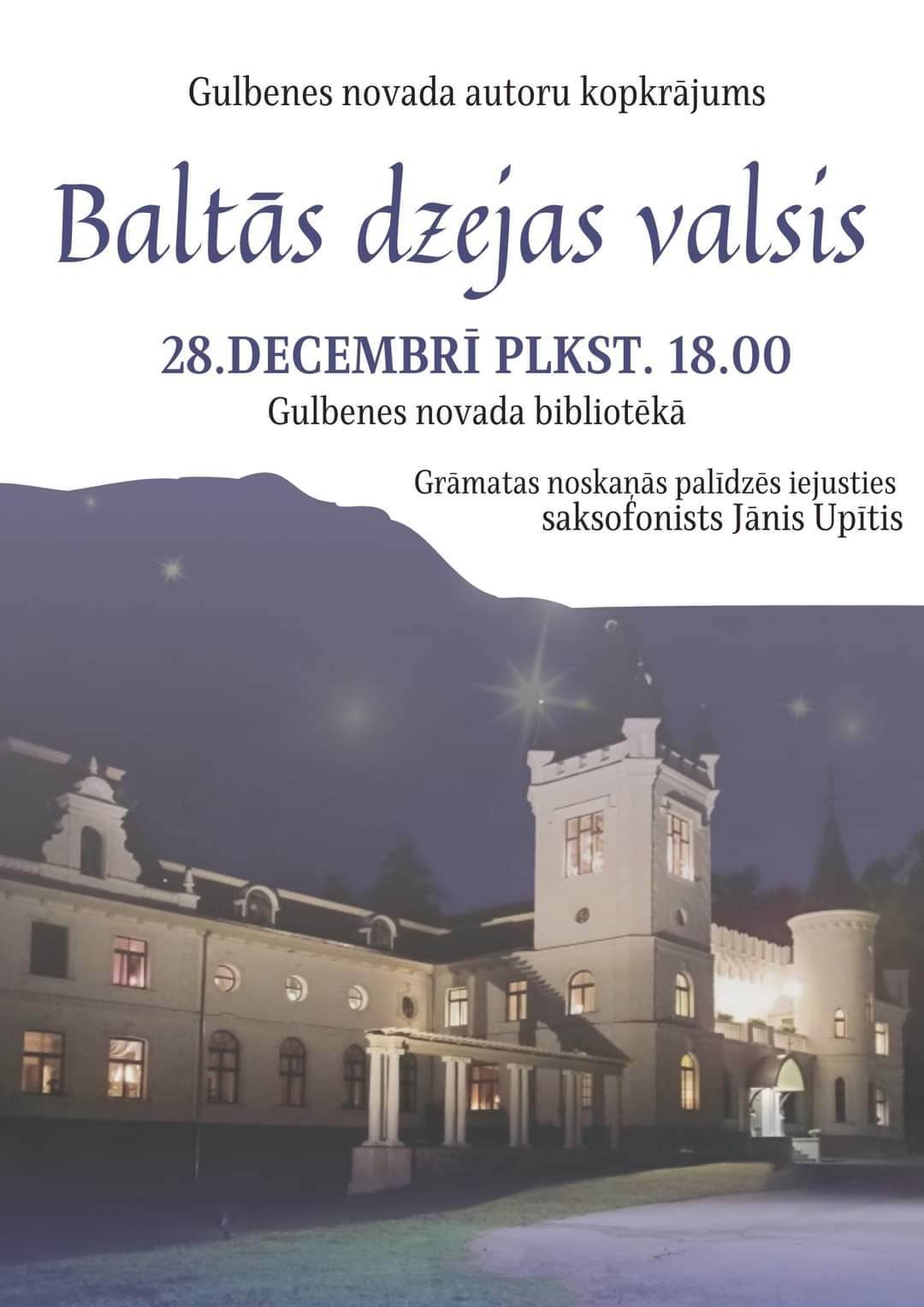 28.decembrī 18.00 Gulbenes novada bibliotēkā – satikšanās ar novada literātu jaunā kopkrājuma “Baltās dzejas valsis” autoriem, kur gaišās noskaņas ar mūziku savīs saksofonists Jānis Upītis. Vakara piedāvājumu kuplinās arī Vītola izdevniecības grāmatu galds. Ieeja – brīva.