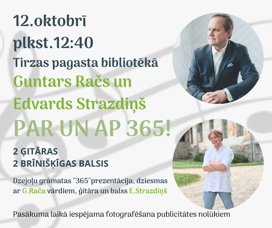 12.oktobrī 12.40 Tirzas pagasta bibliotēkā – Guntars Račs un Edvards Strazdiņš “Par un ap 365!”.
