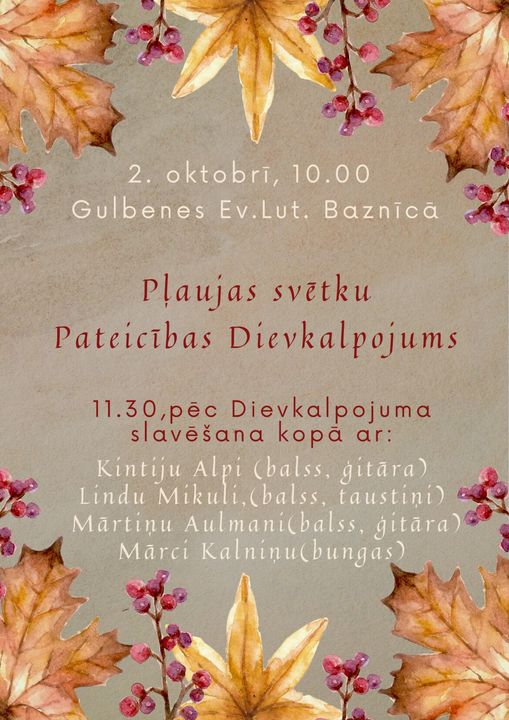 2.oktobrī 11.30 Gulbenes evaņģēliski luteriskajā baznīcā pēc dievkalpojuma muzicēs Kintija Alpe kopā ar Lindu Mikuli (balss, taustiņi), Mārtiņu Aulmani (balss, ģitāra) un Mārci Kalniņu (bungas). Uz koncertu Pļaujas svētkos cilvēki ir aicināti nākt ar no dārza novāktiem augļiem, dārzeņiem vai veikalā iegādātiem produktiem, kuri tiks pēc tam ziedoti Gulbenes slimnīcai.