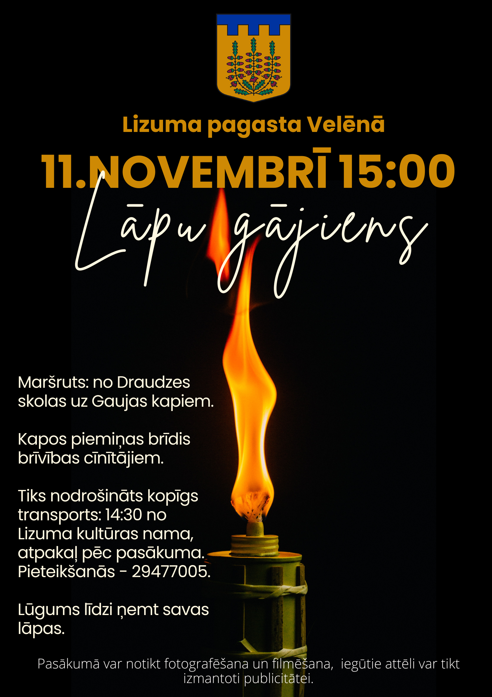 11.novembrī 15.00 Lizuma pagasta Velēnā – lāpu gājiens no Draudzes skolas uz Gaujas kapiem un piemiņas brīdis brīvības cīnītājiem. Lūgums līdzi ņemt savas lāpas. Kopīgs transports 14.30 no kultūras nama un pēc pasākuma atpakaļ. Pieteikties pa tālruni 29477005.