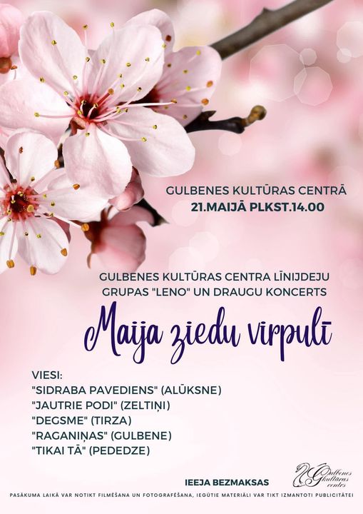 21.maijā 14.00 Gulbenes kultūras centrā – līnijdeju kolektīva “Leno” un draugu koncerts “Maija ziedu virpulī”.