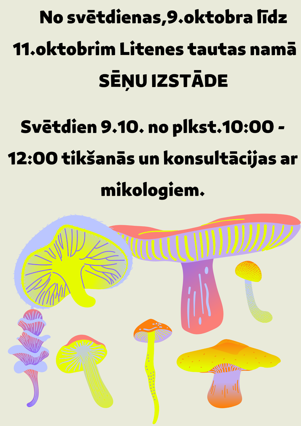 No 9. līdz 11.oktobrim Litenes tautas namā – sēņu izstāde. 9.oktobrī no 10.00 līdz 12.00 – tikšanās un konsultācijas ar mikologiem.