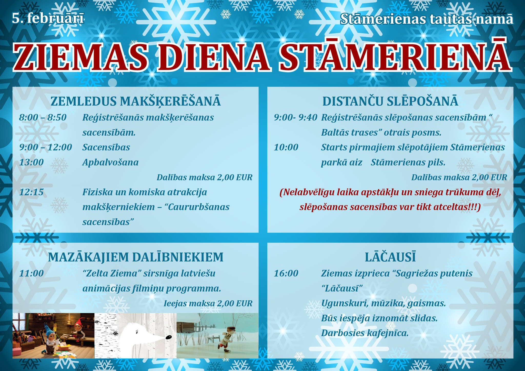 5.februārī 10.00 Stāmerienā – Ziemas izpriecu diena: slēpošanas sacensības, zemledus makšķerēšanas sacensības, ziemas aktivitātes atbilstoši laika apstākļiem, mazākajiem dalībniekiem – “Zelta Ziema”, sirsnīga latviešu animācijas filmiņu programma.