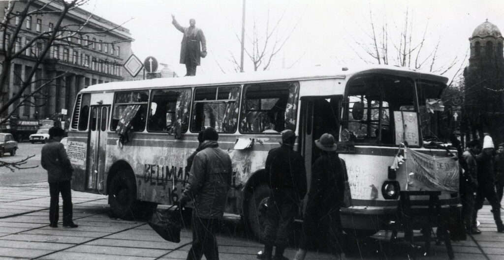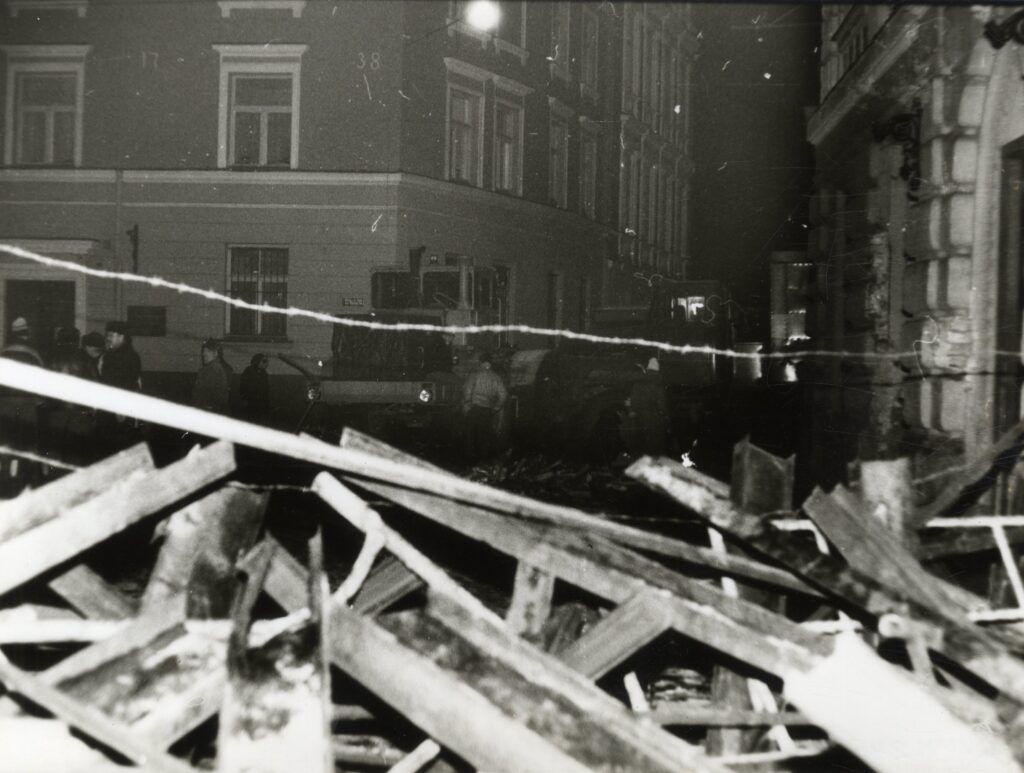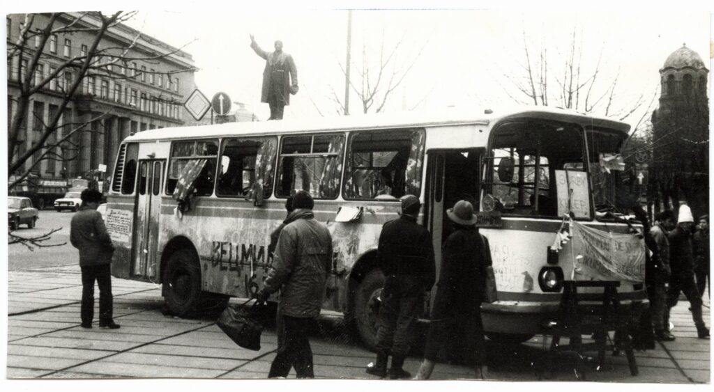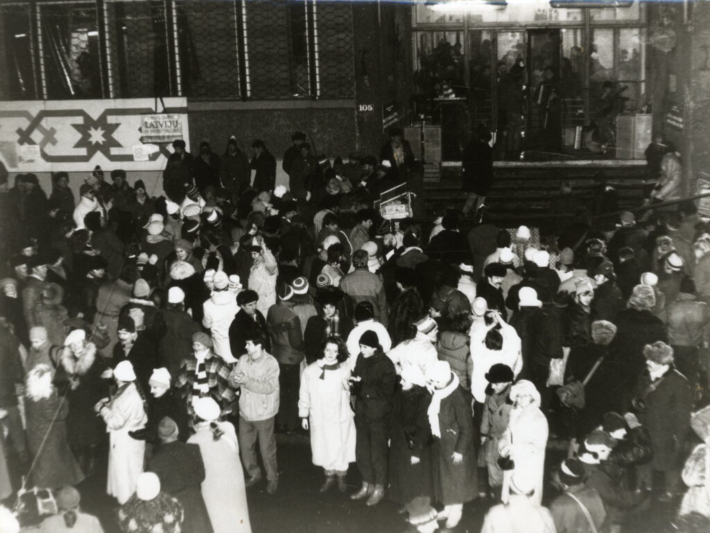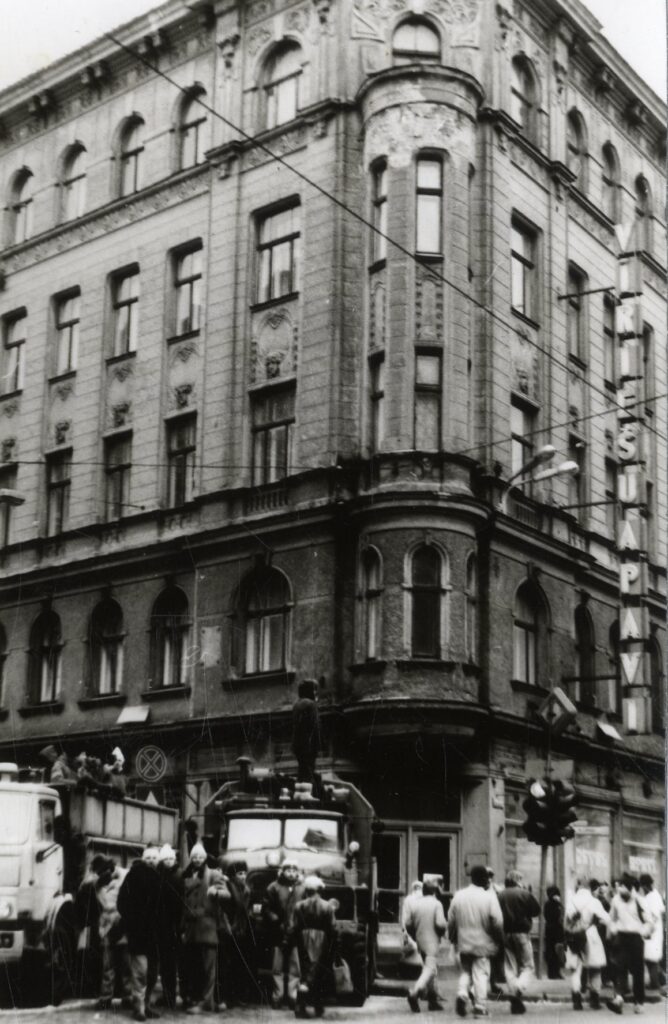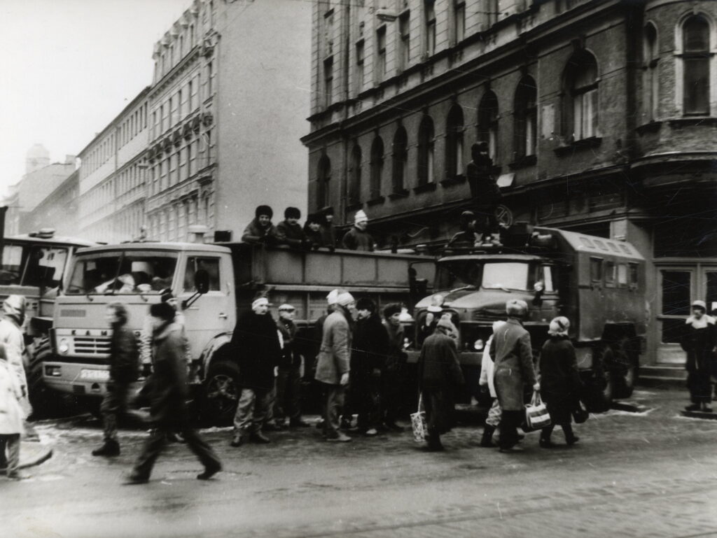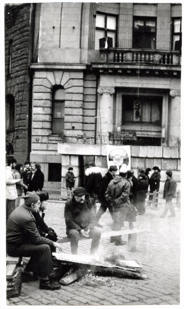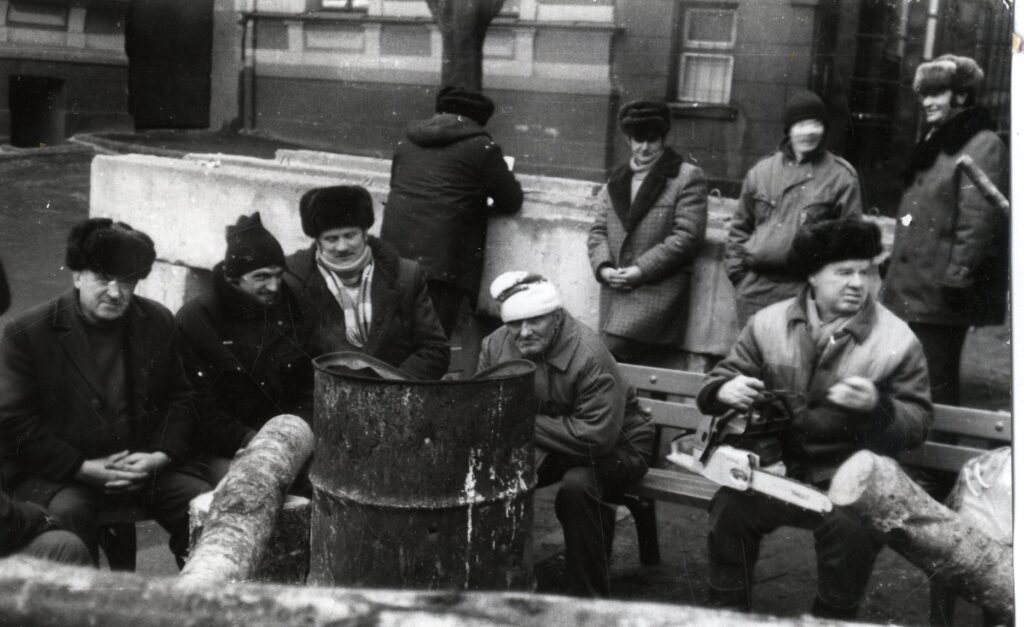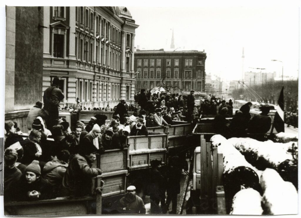 1991.gada janvāra barikāžu notikumi Rīgā, Gulbenes rajona apvienības “Lauktehnika” dalībnieki pie Ministru Padomes. FOTO: NO GULBENES NOVADA VĒSTURES UN MĀKSLAS MUZEJA ARHĪVA