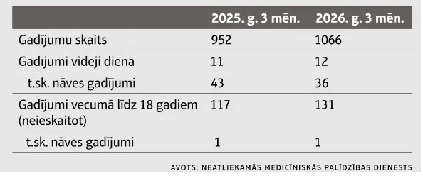 Latvijā pašnāvību mēģinājumu skaitu raksturo Neatliekamās medicīniskās palīdzības dienesta (NMPD) izsaukumu dati. Ja salīdzina 2025. gada un 2026. gada pirmo trīs mēnešu datus, tad pašnāvību mēģinājumu skaits ir palielinājies attiecīgi no 952 līdz 1066 gadījumiem.