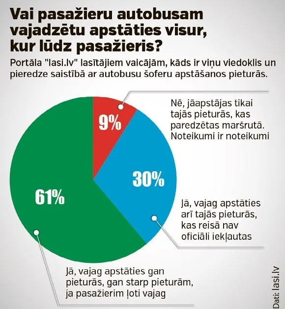 Bet kā ar cilvēku vēlmi, lai viņus izlaiž no autobusa pavisam ārpus pieturas, tā teikt, piemājas ceļa galā? J.Lapiņš komentē īsi: “Ministru kabineta noteikumi nosaka izlaišanas un iekāpšanas kārtību pieturās. Turklāt jebkura apstāšanās ietekmē autobusa grafiku.”