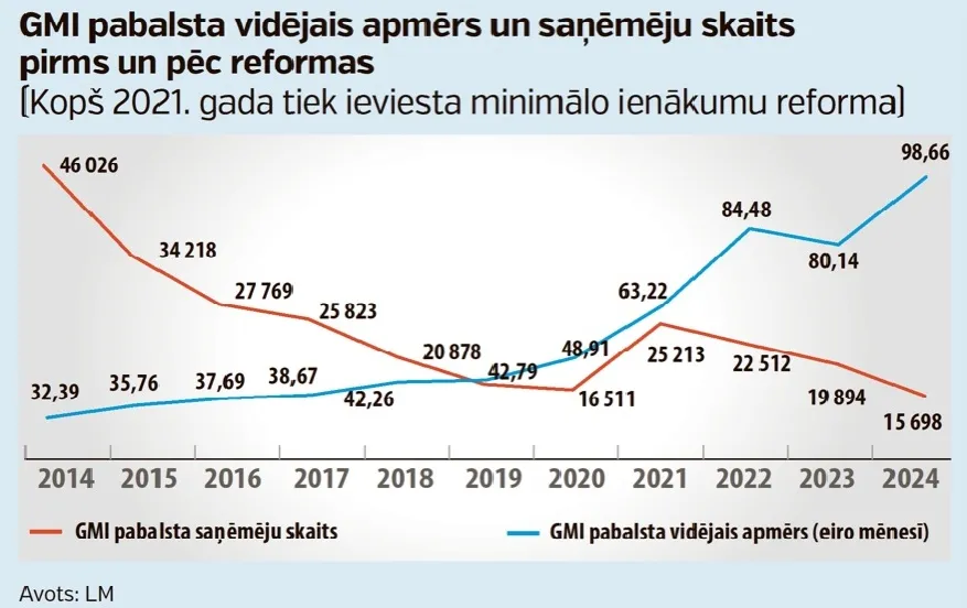 Vērtējot nacionālos monetārās nabadzības rādītājus – garantēto minimālo ienākumu (GMI), trūcīgas mājsaimniecības ienākumu un maznodrošinātas mājsaimniecības ienākumu slieksni –, ministrijas pārstāve E.Kūla atzīmē, ka kopš minimālo ienākumu reformas ieviešanas (reforma sākta 2021. gadā) situācija katru gadu uzlabojas. Lai arī ik gadu pārskatīšanas rezultātā visi trīs ienākumu sliekšņi aug, cilvēku skaits, kuri saņem šos pabalstus, sarūk. “Tas liecina, ka zemu ienākumu mājsaimniecībās situācija pakāpeniski uzlabojas un viņu ienākumi palielinās, pārsniedzot noteikto ienākumu sliekšņu apmērus.”