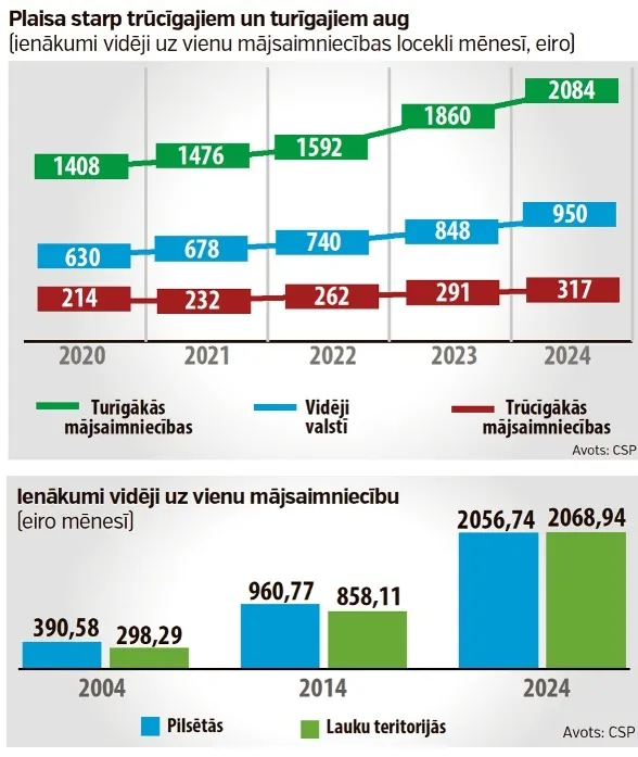 Vienlaikus dati Latvijā uzrāda ļoti augstu ienākumu nevienlīdzību. 2024. gadā visturīgāko iedzīvotāju ienākumi bija 6,7 reizes lielāki nekā vistrūcīgāko iedzīvotāju ienākumi. Savukārt Džini koeficients 2024. gadā bija 35,6 %, uzrādot augstāko reģistrēto ienākumu nevienlīdzības rādītāju pēdējo gadu laikā. No Eiropas Savienības (ES) valstīm vienīgi Bulgārijā plaisa starp nabadzīgajiem un turīgajiem ir vēl izteiktāka. Vistrūcīgākajās Latvijas mājsaimniecībās 2024. gadā ienākumi uz vienu mājsaimniecības locekli bija vidēji 317 eiro mēnesī, bet visturīgākajās mājsaimniecībās – vidēji 2084 eiro mēnesī. Nevienai no trūcīgākajām mājsaimniecībām ienākumi nebija augstāki par 474 eiro uz vienu mājsaimniecības locekli mēnesī, bet turīgāko mājsaimniecību vidū šis rādītājs bija 1327 eiro.