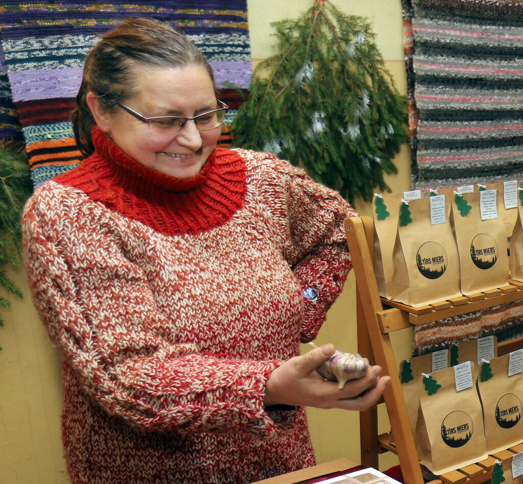 TIRDZIŅĀ – Rankas cilvēku darinājumi: zeķes, cepures, cimdi, medus, dažādi našķi, rotas un citas lietas. Pircēji Ziemassvētku tirdziņā priekšroku dod kafijai, sukādēm, svecēm un ir pārsteigti, ka tas viss tapis tepat Rankā. Foto: Gatis Bogdanovs.