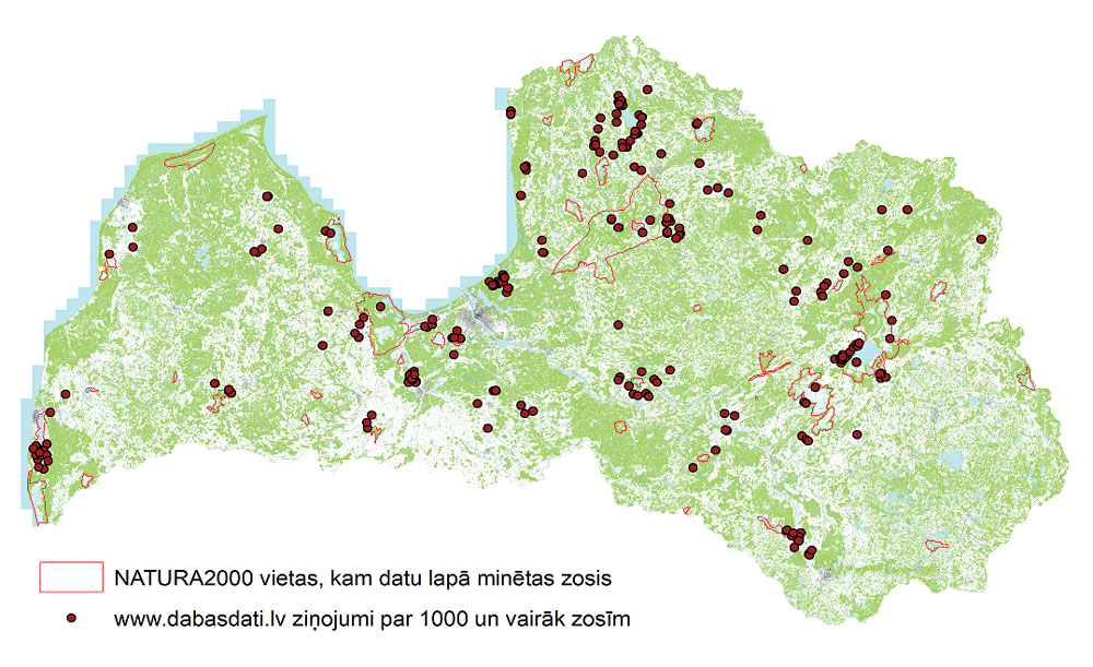 GADA PAVASARĪ novērošanai izvēlētās zosu koncentrēšanās vietas Latvijā. Avots: LU