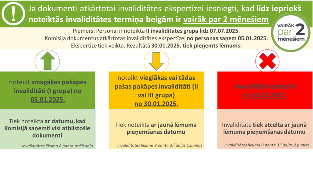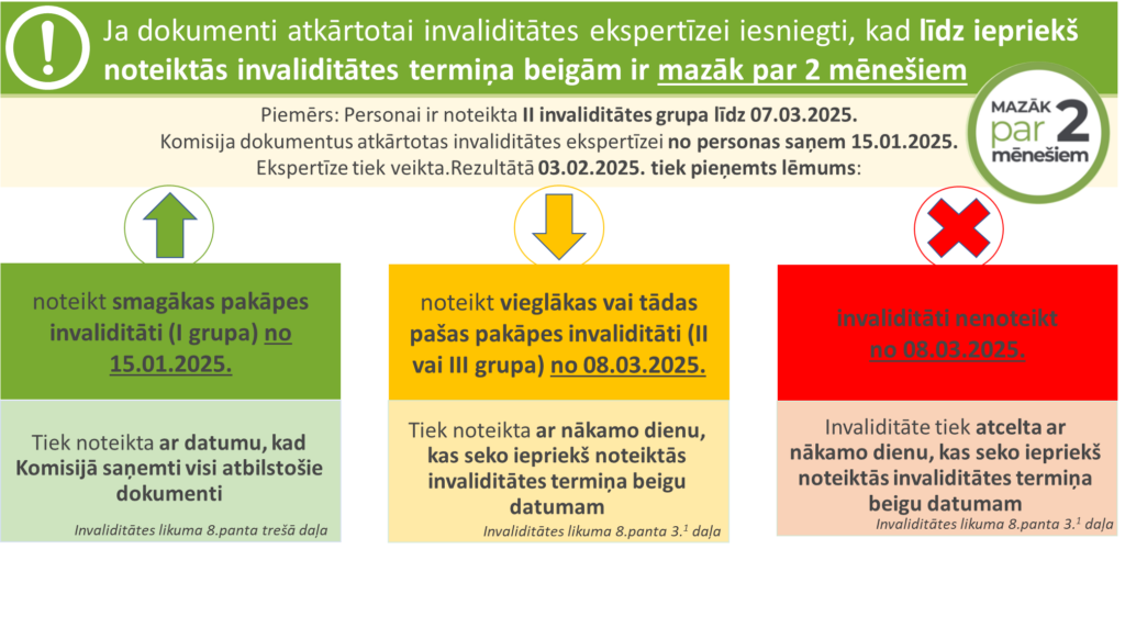 Personām jāņem vērā arī tas, ka šobrīd atkārtotas invaliditātes termiņa sākuma datums ir atkarīgs no dokumentu iesniegšanas laika invaliditātes ekspertīzei Komisijā. Atkārtotas invaliditātes termiņa pirmā diena ir atkarīga no tā, vai persona dokumentus iesniedz laikā, kad līdz esošās invaliditātes termiņa beigām ir mazāk par diviem mēnešiem vai vairāk par diviem mēnešiem.