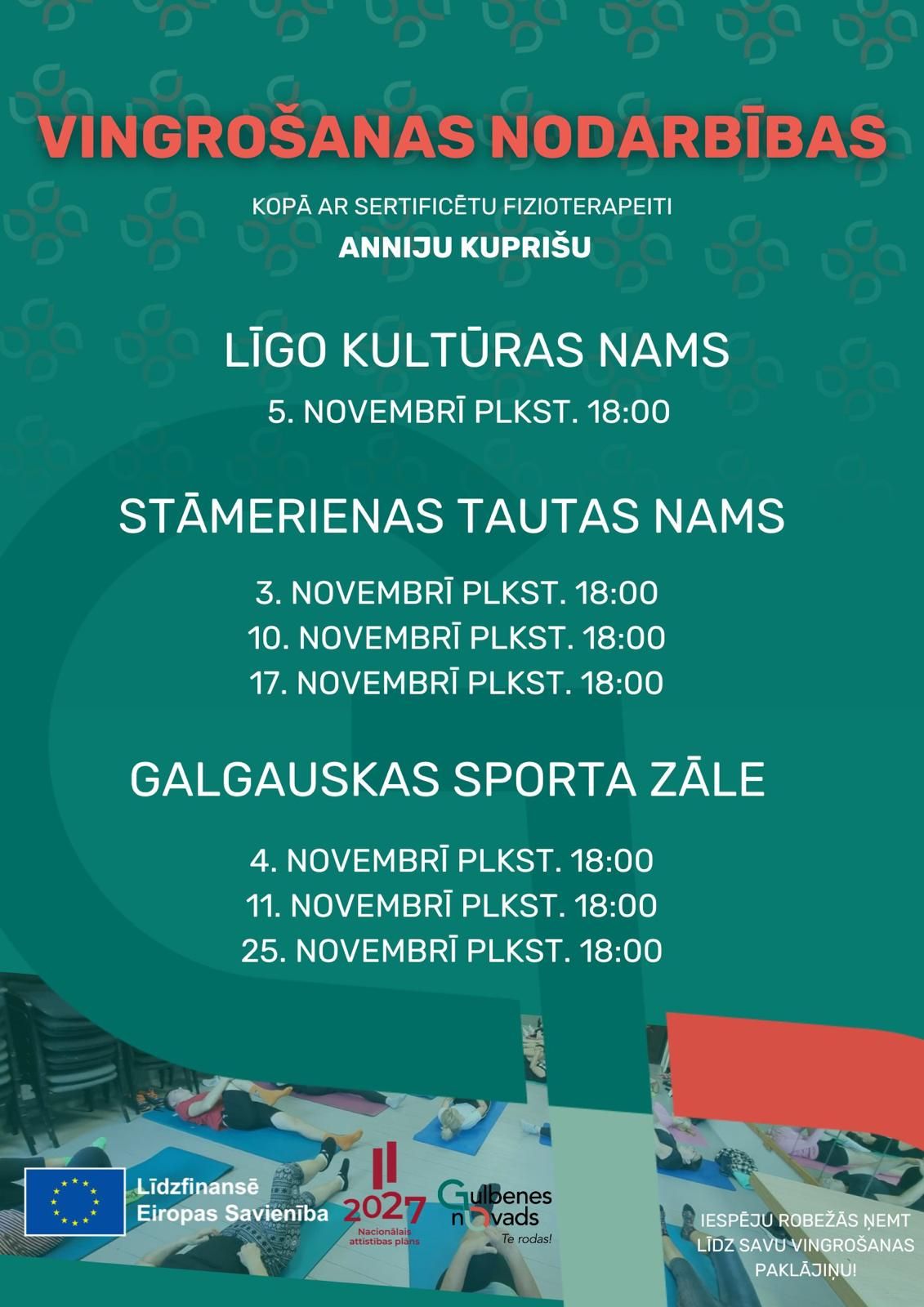 Bezmaksas vingrošanas nodarbības sertificētas fizioterapeites Annijas Kuprišas vadībā turpinās. Novembrī nodarbības plānotas Līgo kultūras namā, Stāmerienas tautas namā un Galgauskas sporta zālē. Par to informē Gulbenes novada pašvaldība.