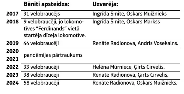 Pagājušajā sestdienā Gulbenē startēja kārtējais velobrauciens “Apsteidz tvaiku!”, kurā ar tvaika lokomotīvi “Ferdinands” un tā ritošo sastāvu sacentās 125 dalībnieki. Kopš 2017.gada maršrutā Gulbene-Alūksne notikušas četras sacensības, bet maršrutā Alūksne-Gulbene – tikai divas. Sacensības rīkoja Gulbenes novada Sporta pārvalde, Alūksnes novada pašvaldība un biedrība “VeloRīts”.