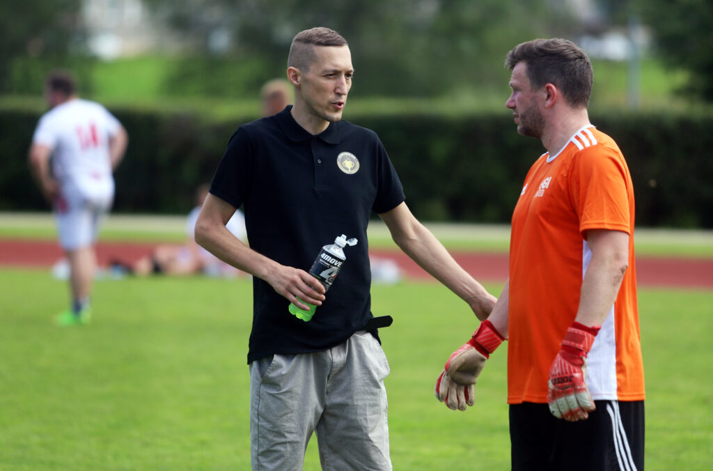 “CĒZARA KAUSA” organizators Artūrs Deksnis (no kreisās). Viņam blakus “Iggi United” komandas pārstāvis un viņa draugs Artūrs Broks. FOTO: GATIS BOGDANOVS