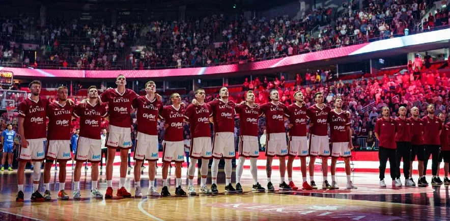 LATVIJAS VĪRIEŠU valstsvienībai cīņa par tiesībām spēlēt Parīzes olimpisko spēļu turnīrā “Arēnā Rīga” notiks no 2. līdz 7. jūlijam. FOTO: NO “BASKET.LV”