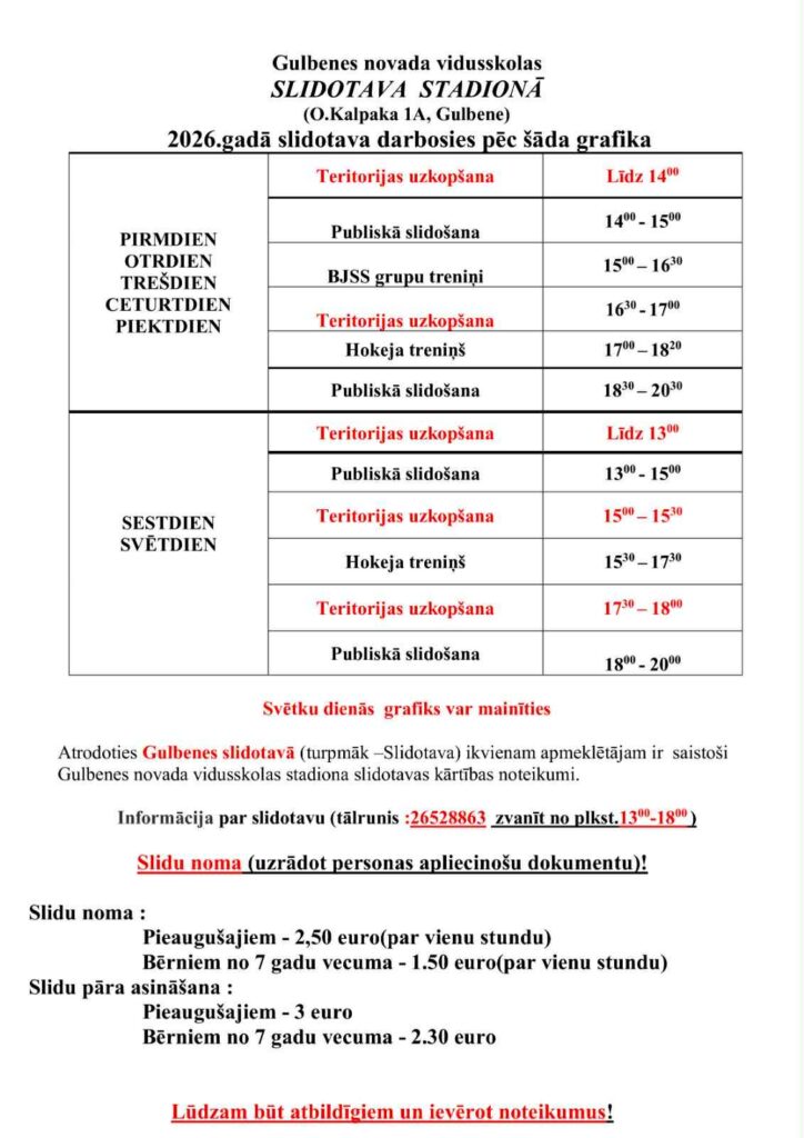Ir zināms, pēc kāda grafika darbosies slidotava Gulbenes pilsētas stadionā.