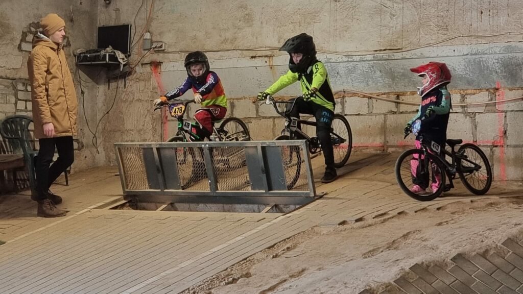 Iekštelpu trases treniņš Valmiermuižā. Te bērniem ir iespēja trenēties pie starta barjeras – starta izrāvienu, mazajiem mācīties nostāties pie barjeras. Starta izrāviens un reakcija sacensībās ir ļoti būtisks faktors, kad pie barjeras stāv astoņi sportisti, lai izcīnītu labāko pozīciju trasē un pretinieks neizspiestu no tās. Foto: no personiskā arhīva.