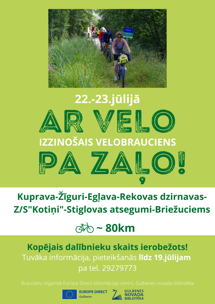 22. un 23.jūlijā Gulbenes novada bibliotēka un “Europe Direct” centrs Gulbenē organizē izzinošu velobraucienu “Ar velo pa zaļo!”.