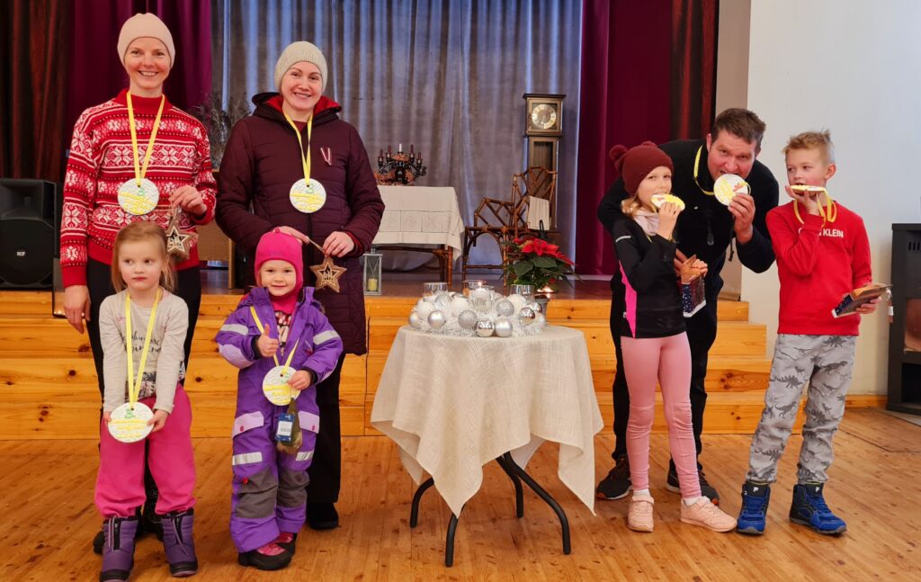 Labdarības skrējiena mazo distanci veica Vilis un Kate Birznieki, Inese un Stella Palas, Aija Tīruma un Lote Oša, Kristers Millenbergs un seniore Ruta Bernāne. Vidējo distanci pa sniegotajā takām noskrēja Sintija Birzniece, un garāko – piecu kilometru – distanci noskrēja Dace Birzniece un Marguss Pala.