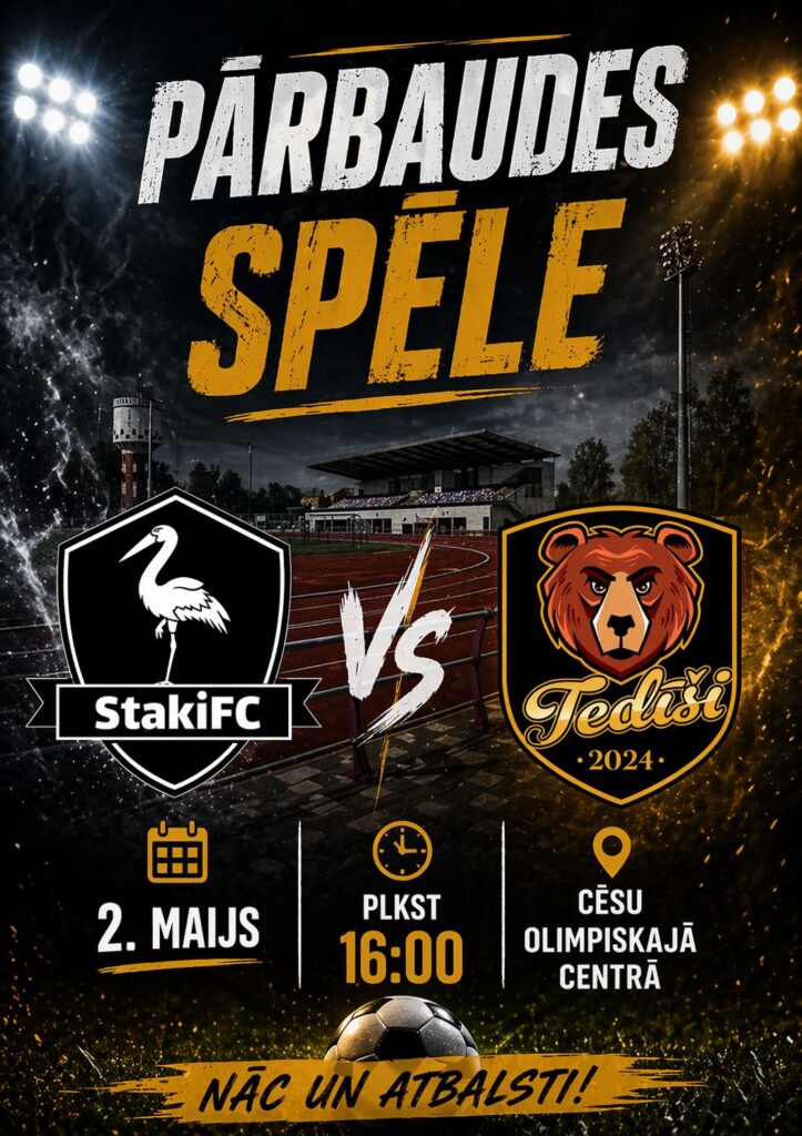 Futbola komanda “FC Stāķi” 2. maijā spēlēs ar Rīgas komandu “SK Tedīši” Cēsu Olimpiskajā centrā.