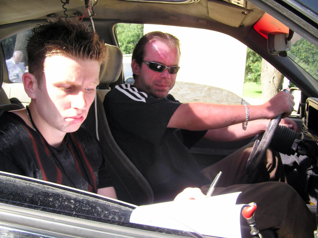Tagadējais ralliju rīkotājs Jānis Sniedzāns (no labās) 2004. gadā piedalījās sacensībās kopā ar Māri Aleksandrovu. Foto: no “Dzirksteles” arhīva