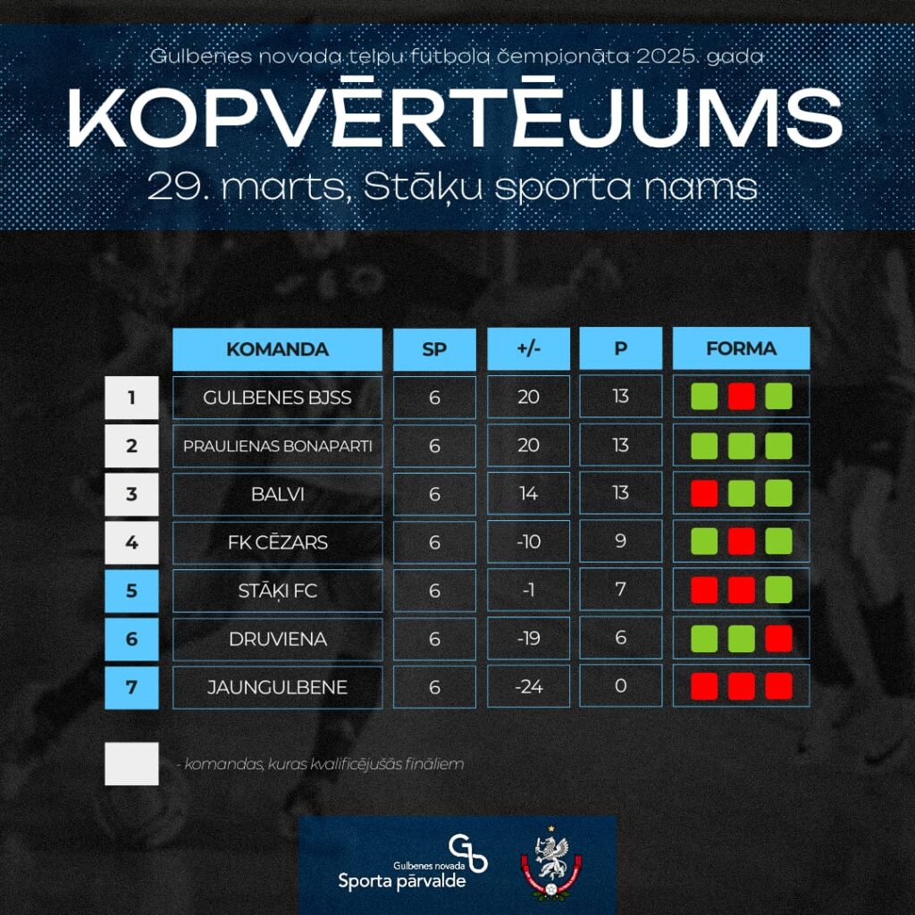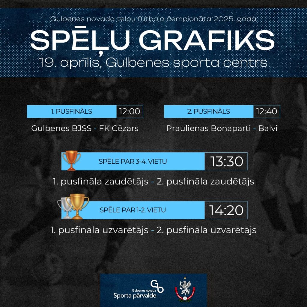 “Dzirkstele” jau rakstīja, ka Gulbenes novada telpu futbola čempionātā šogad piedalās septiņas komandas, no kurām divas ir no kaimiņu novadiem – Balviem un Madonas. Čempionātā piedalās komandas: “Balvi”, “Druviena”, “Gulbenes BJSS”, “Praulienas Bonaparti”, “FK Cēzars”, “Stāķi FC”, “Jaungulbene”. Marta sākumā notika pirmais sabraukums, kurā katra komanda nospēlēja pirmās divas spēles. Nākamajos divos sabraukumos pamatturnīrā tika noskaidrots fināla četrinieks, kas cīnīsies par čempionu titulu.