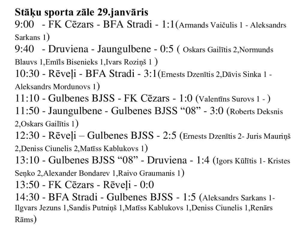 “Spēle bija dinamiska, uzbrukums pēc uzbrukuma ar vairākām izspēlēm. Galarezultātā draudzīgs neizšķirts – 1:1. Dienas otrajā spēlē tikās jaunpienācēja “Druviena”, kura vairākus gadus nebija spēlējusi telpu futbolu novada čempionātā, pret “Jaungulbeni”. “Jaungulbene” jau no spēles sākuma pārņēma spēles iniciatīvu, un tas attaisnojās rezultātā. Otrajā puslaikā “Druviena” veica vārtsarga maiņu, bet tas nelīdzēja, rezultātā bezierunu zaudējums – 0:5. Trešajā spēlē tikās “Rēveļi” un “BFA Stradi”, spēle bija ar vairākām izspēlēm un vārtu guvumiem. “Rēveļu” jaunie spēlētāji nokārtoja sev par labu rezultātu – 3:1. Nākamā spēle bija “Gulbenes BJSS” pret “FK Cēzars”. Liktās cerības, ka būs interesanta spēle, attaisnojās. Abas komandas centās vairāk pieturēt bumbu un atrast vienu caurumu aizsardzībā, lai iesistu vārtus. Viens veiksmīgs uzbrukums no “Gulbenes BJSS” komandas noveda pie spēles rezultāta, kurš nemainījās – 1:0. “Jaungulbenes” un jauno “Gulbenes BJSS 08” spēlē bumbas kontrole vairāk bija jaungulbeniešu pusē. Protams, jaunieši no “Gulbenes BJSS” spurojās pretī, bet nepietiekami – 0:3. “Rēveļu” un “Gulbenes BJSS” spēlē bija ātri trīs vārti no gulbeniešu puses, otrajā puslaikā gulbenieši drusku atslāba un ielaida divus vārtus, bet tad viņi atbildēja vēl ar diviem vārtiem, rezultātā – 5:2 “Gulbenes BJSS” labā. Nākamā dienas spēle bija “Gulbenes BJSS 08” pret “Druvienu”. Spēles sākumā bija uzbrukums pēc uzbrukuma, no vieniem vārtiem uz otriem vārtiem. Bumba ceļu atrada tikai uz jauno gulbeniešu vārtiem, bet jaunieši spēles pēdējās minūtēs spēja gūt goda vārtus. Beigās “Druvienai” droša uzvara ar 4:1. Dienas pirmspēdējā spēlē tikās “FK Cēzars” un “Rēveļi”. Abas komandas spēlēja piesardzīgi, pieturot bumbu un veidojot savus uzbrukumus. Bija vairākas iespējas abām komandām, bet šajā spēlē bija dienas otrais neizšķirts – 0:0. Dienas pēdējā spēlē tikās “BFA Stradi” un “Gulbenes BJSS”. “Gulbenes BJSS” atkal ātri guva 4 bezatbildes vārtus, bet “BFA Stradi” vienus vārtus atguva. Ar to nepietika, jo gulbenieši iesita vēl vienus vārtus, galarezultātā – 1:5 par labu “Gulbenes BJSS”,” stāsta J.Stībelis.